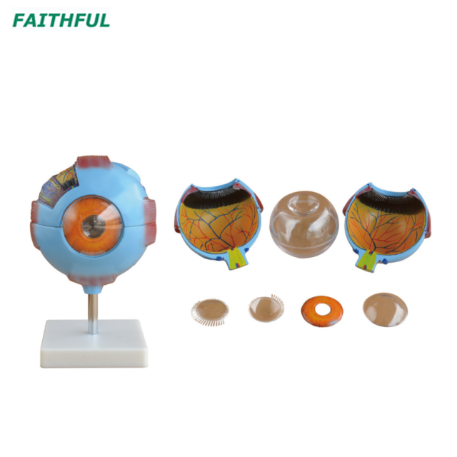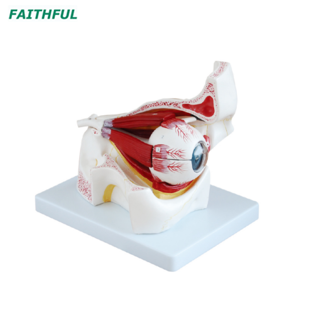 Модель показывает глазное яблоко с зрительными нервами и мышцами внедрена естественным положением на костной орбите. Расширяется в 10 частей 3 раза увеличена.