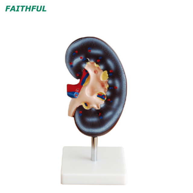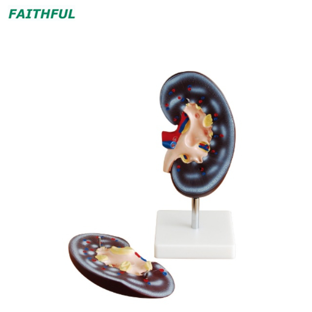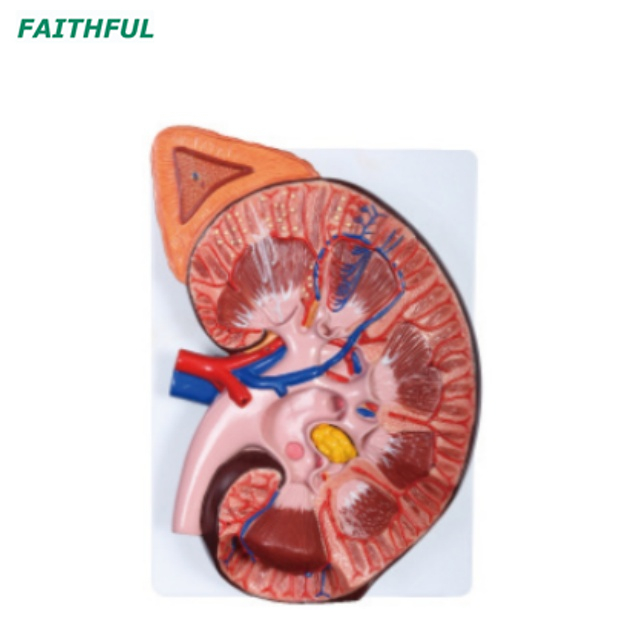 Эта модель показывает 3 раза, увеличенную из почки, с надпочечниками, 2 компонентами, показывающими почечную кору, почечную медулу, проксимальную страхнутую канальца, дистальные разгибаемы таз, мочеточница, межлокулярная артерия, вена, почечная артерия, вена и ренкапсул.