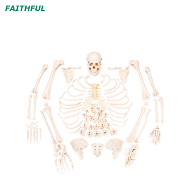 Размещение в натуральную величину, рассеянный скелет для взрослых включает в себя череп из 3 частей, одну руку и одну ногу на проволоке.