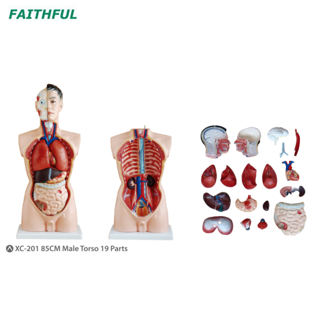 Это полноразмерный мужской торс. Ручная рука и тщательно собрана для имитации анатомии человека. Рассекает на 19 частей: туловище, голова (2 части), мозг, легкие (4 части), сердце, трахея, пищевод и нисходящая аорта, диафрагма, желудок, двенадцатиперстная кишка с поджелудочной железой и селезенкой, кишечником, почкой, мочевым пузырем (2 частями) и печень.